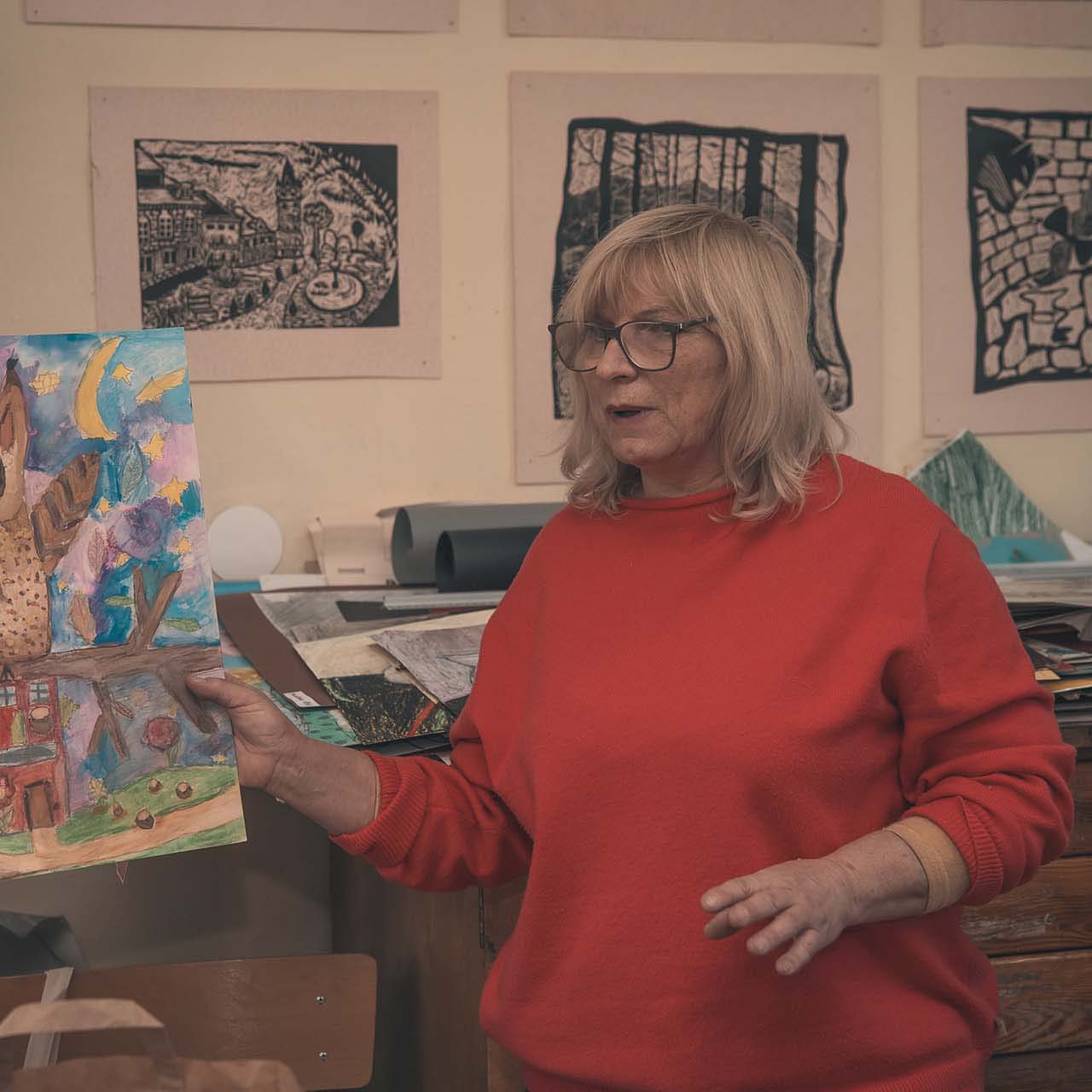 Prowadzi zajęcia plastyczne dla dzieci, kształtując ich rozwój. Pedagog z doświadczeniem i wielkim sercem.